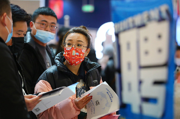 2月6日,求職者在滕州市新春人才招聘會上了解就業(yè)信息。