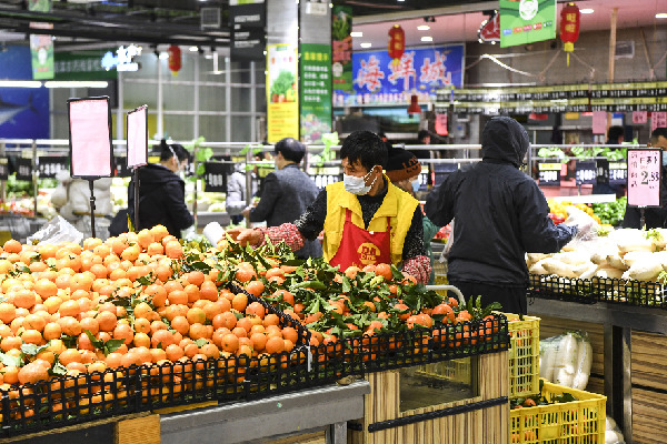 2月9日,工作人員在廣西德??h一家超市內(nèi)補(bǔ)充投放新鮮水果。