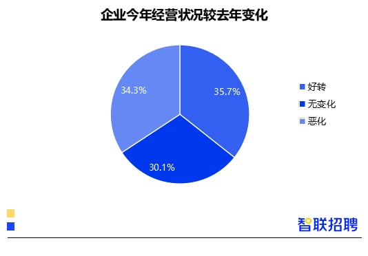 智聯(lián)招聘春節(jié)后面向企業(yè)的調(diào)研數(shù)據(jù)顯示,35.7%的企業(yè)表示今年春季經(jīng)營狀況比去年好轉(zhuǎn),34.3%表示惡化,30.1%認(rèn)為無變化。各占3成,判斷截至目前,今年春季企業(yè)總體經(jīng)營狀況較為平穩(wěn)。
