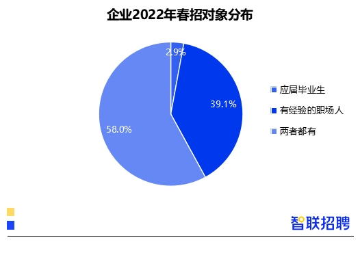 從企業(yè)春招對(duì)象來看,調(diào)研顯示,58%的受訪企業(yè)同時(shí)招聘有工作經(jīng)驗(yàn)的職場人和應(yīng)屆高校畢業(yè)生,39.1%僅針對(duì)有經(jīng)驗(yàn)的職場人,2.9%僅招聘應(yīng)屆畢業(yè)生。此外,近九成的企業(yè)在春季校招時(shí),同時(shí)面向2021屆和2022屆高校畢業(yè)生。