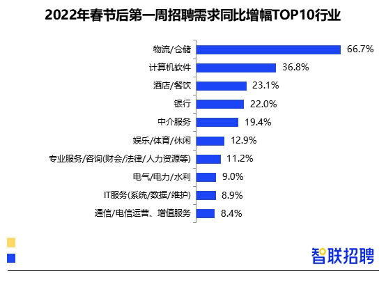 開工第一周招聘需求同比增幅前十行業(yè)中,物流/倉儲(chǔ)行業(yè)崗位需求旺盛,職位數(shù)增幅排名第一。疫情后,物流倉儲(chǔ)行業(yè)招工需求持續(xù)上漲,今年春季依然保持這一趨勢。計(jì)算機(jī)軟件、酒店/餐飲、銀行等行業(yè)招聘職位數(shù)同比增幅也相對(duì)較大。