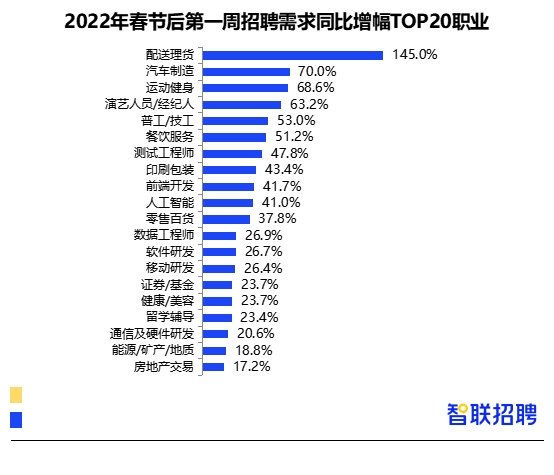 2月14日,智聯(lián)招聘發(fā)布了最新一期2022年春招市場行情周報(bào)。2022年春節(jié)后第一周,隨著企業(yè)復(fù)工復(fù)產(chǎn)和人員流動(dòng),就業(yè)市場供需雙方的活躍度開始上升。節(jié)后第二周,各地高校開學(xué)季逐漸拉開帷幕,企業(yè)招聘和畢業(yè)生求職將迎來小高潮。