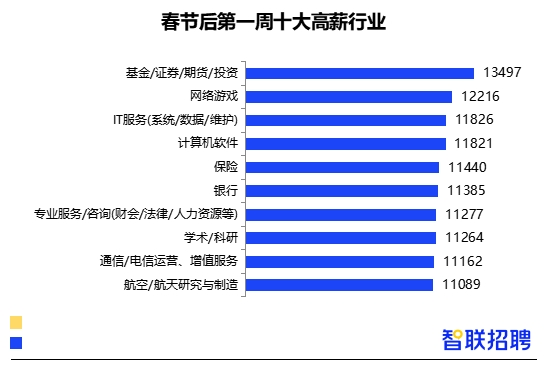 分行業(yè)來看,春節(jié)后首周基金/證券/期貨/投資行業(yè)的平均招聘薪酬高達(dá)13497元/月,仍位居行業(yè)之首,網(wǎng)絡(luò)游戲行業(yè)排名第二,IT服務(wù)(系統(tǒng)/數(shù)據(jù)/維護(hù))和計(jì)算機(jī)軟件行業(yè)分列第三和第四,薪酬水平為11826元/月和11821元/月。月薪過萬行業(yè)數(shù)量較去年有明顯增加,保險(xiǎn)、銀行、專業(yè)服務(wù)咨詢、通信電信、航空航天等行業(yè)也躋身“萬元俱樂部”。