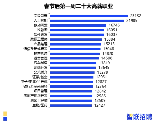 高薪職業(yè)中,企業(yè)高層管理人員薪酬為23132元/月,處于榜首。人工智能領(lǐng)域人才缺口大,企業(yè)紛紛通過高薪搶人引才,春節(jié)后第一周平均招聘薪酬為21985元/月,也進(jìn)入月薪過2萬元的職業(yè)行列,較去年同期(18821元/月)有明顯上升。高薪職業(yè)中技術(shù)類人才居多,如移動(dòng)研發(fā)、數(shù)據(jù)工程師、通信及硬件研發(fā)、前端開發(fā)等,金融類人才的薪酬水平也較為可觀,如投融資、基金證券、銀行和金融服務(wù)等職業(yè)薪酬水平也較高。