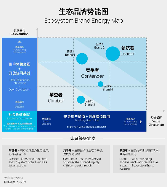 2021年,凱度、牛津大學(xué)賽德商學(xué)院、《哈佛商業(yè)評論》中文版一起合作,共同制定并全球首發(fā)「生態(tài)品牌認(rèn)證體系」,從「共同進(jìn)化」、「價(jià)值循環(huán)」和「品牌理想」三大視角及其下屬的五個(gè)核心維度(用戶體驗(yàn)交互、開放協(xié)同共創(chuàng)、終身用戶價(jià)值、共贏增值效用、社會(huì)價(jià)值貢獻(xiàn))和16項(xiàng)評估細(xì)則出發(fā),評估品牌在生態(tài)品牌轉(zhuǎn)型與打造過程中的成效和進(jìn)化階段。