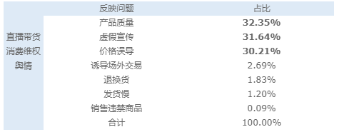 報(bào)告顯示,直播帶貨消費(fèi)維權(quán)輿情反映的主要問(wèn)題中,涉及產(chǎn)品質(zhì)量問(wèn)題的占32.35%,虛假宣傳的占31.64%,價(jià)格誤導(dǎo)的占30.21%,誘導(dǎo)場(chǎng)外交易的占2.69%,退換貨的占1.83%,發(fā)貨慢的占1.20%,銷售違禁商品的占0.09%。其中,產(chǎn)品質(zhì)量、虛假宣傳、價(jià)格誤導(dǎo)等直播帶貨問(wèn)題最為突出。