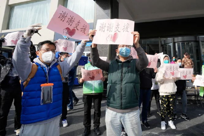 ????“謝謝!感謝你們對閔行的支持!”閔行區(qū)委書記陳宇劍來到集散點迎接醫(yī)療隊,并抱拳致謝。虹橋鎮(zhèn)的工作人員也打出“熱烈歡迎杭州中醫(yī)院白衣天使”等標(biāo)語迎接。