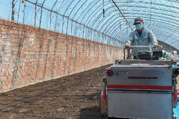 4月15日,在吉林省吉林市龍?zhí)秴^(qū)江北鄉(xiāng)棋盤村,農(nóng)民操作水稻秧盤播種機(jī)進(jìn)行育苗工作。