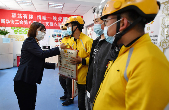 “五一”國(guó)際勞動(dòng)節(jié)來(lái)臨之際,寧夏銀川市興慶區(qū)新華街工會(huì)開展“驛站有你 情暖一線勞動(dòng)者”慰問(wèn)活動(dòng)。工作人員根據(jù)征集來(lái)的“工友微心愿”準(zhǔn)備慰問(wèn)品,為勞動(dòng)者送上電飯煲、保溫壺、夏涼被、米、面、油等節(jié)日禮物。