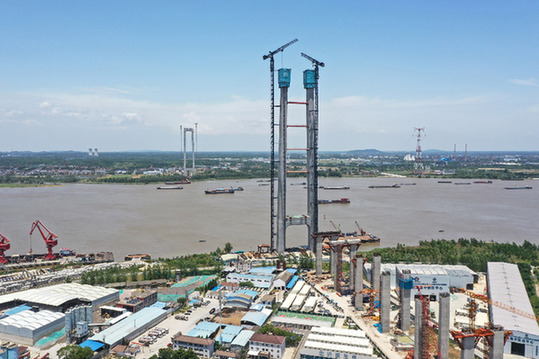 正在建設(shè)中的龍?zhí)堕L(zhǎng)江大橋位于南京長(zhǎng)江四橋與潤(rùn)揚(yáng)長(zhǎng)江大橋之間,北接揚(yáng)州儀征市,南接南京市、鎮(zhèn)江句容市,雙向六車道,設(shè)計(jì)時(shí)速100公里,全長(zhǎng)4925米。新華社記者 楊磊 攝