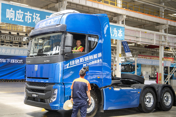山西新能源汽車工業(yè)有限公司(吉利晉中基地)總裝車間內(nèi),工作人員駕駛甲醇汽車進行出廠前的調(diào)試。新華社記者 楊晨光 攝