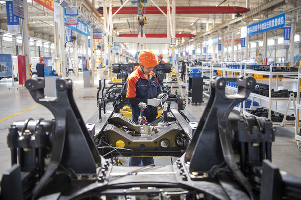 山西新能源汽車工業(yè)有限公司(吉利晉中基地)總裝車間內(nèi),工作人員在生產(chǎn)甲醇汽車。新華社記者 楊晨光 攝
