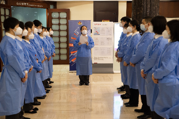 李婷(中)在給團(tuán)隊(duì)開晨會(huì),傳達(dá)當(dāng)天的服務(wù)要求。