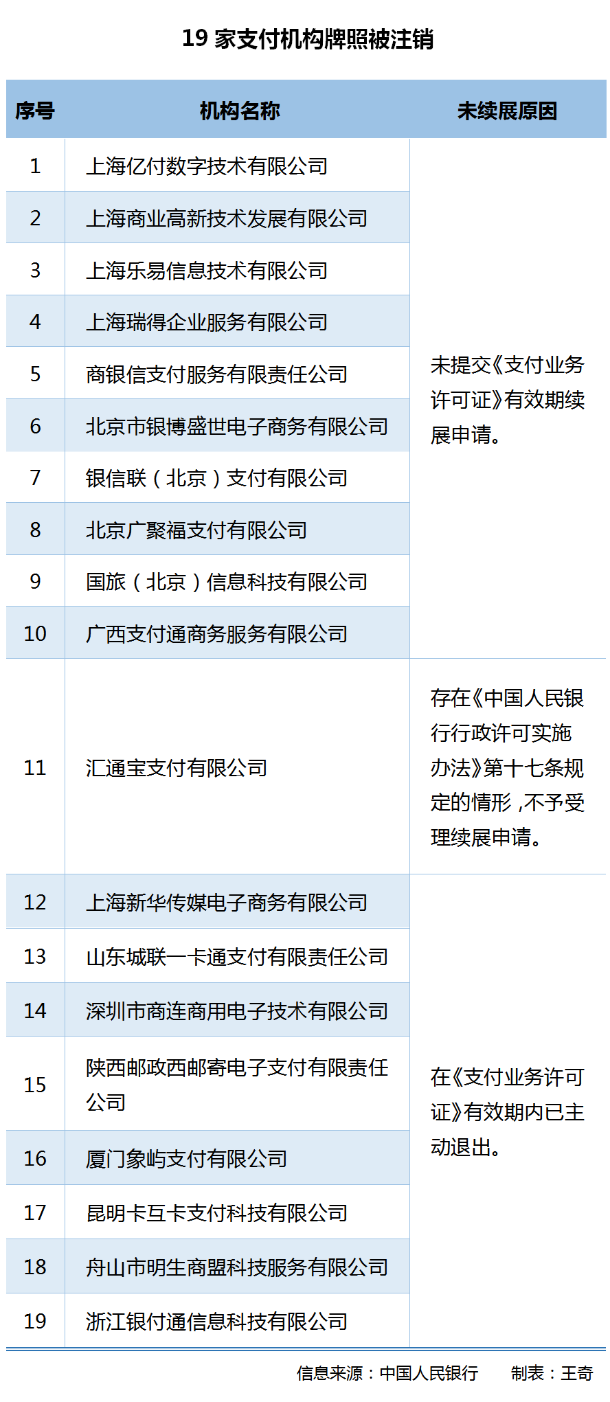 此次公布的續(xù)展結(jié)果,19家注銷(xiāo)的支付牌照中,上海億付數(shù)字技術(shù)有限公司、上海商業(yè)高新技術(shù)發(fā)展有限公司、上海樂(lè)易信息技術(shù)有限公司等10家機(jī)構(gòu)因未提交《支付業(yè)務(wù)許可證》有效期續(xù)展申請(qǐng)而不再續(xù)展;海新華傳媒電子商務(wù)有限公司、山東城聯(lián)一卡通支付有限責(zé)任公司、深圳市商連商用電子技術(shù)有限公司等8家機(jī)構(gòu)在《支付業(yè)務(wù)許可證》有效期內(nèi)主動(dòng)退出。