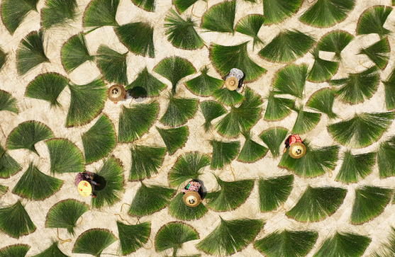 7月6日,在湖南省衡陽(yáng)市祁東縣金橋鎮(zhèn)金龍村,村民在晾曬席草(無(wú)人機(jī)照片)。