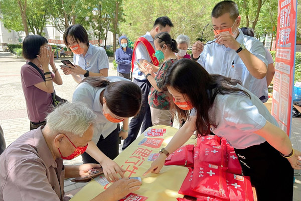 7月18日,北京市啟動(dòng)了北京餐飲消費(fèi)券發(fā)放,提振市民消費(fèi)信心,紓困幫扶餐飲企業(yè)。在北京市商務(wù)局指導(dǎo)下,建設(shè)銀行北京分行主動(dòng)請(qǐng)纓承接本次餐飲優(yōu)惠券發(fā)放活動(dòng),依托“建行生活”平臺(tái),首期配套3000多萬元費(fèi)用,聯(lián)合“全聚德”“肯德基”“必勝客”“便宜坊”“好利來”“味多美”等知名餐飲商戶,在平臺(tái)上發(fā)放“滿100元減30元”“滿50元減15元”政府優(yōu)惠券,并在此基礎(chǔ)上增配“滿20元減10元”優(yōu)惠券。圖為建行工作人員進(jìn)入社區(qū)指導(dǎo)老年人如何通過“建行生活”領(lǐng)取使用北京消費(fèi)券。(楊婷 攝)