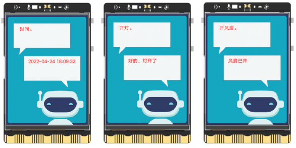 具體功能和操作如下,首先,將LED燈、風(fēng)扇外接到行空版上,之后給行空板配置網(wǎng)絡(luò),接著編寫并運(yùn)行程序,在行空版屏幕上顯示背景圖和初始信息后,按下板載按鍵錄制語音,等待行空板依據(jù)程序自動將語音上傳至百度語音平臺并返回得到語音對應(yīng)的文字內(nèi)容,隨后對文字內(nèi)容進(jìn)行判別,當(dāng)其中有“時(shí)間”兩個字時(shí),自動檢測系統(tǒng)的時(shí)間并更新顯示在行空板的屏幕上,而當(dāng)文字內(nèi)容中有“開燈”、“關(guān)燈”、“開風(fēng)扇”、“關(guān)風(fēng)扇”、“開鬧鐘”、“關(guān)鬧鐘”等信息時(shí),行空板控制LED等、風(fēng)扇、板載蜂鳴器執(zhí)行相應(yīng)的操作。