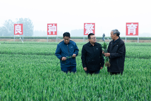 河北省小麥育種首席專家郭進(jìn)考(右一)和同事在察看麥苗生長(zhǎng)情況。受訪者供圖