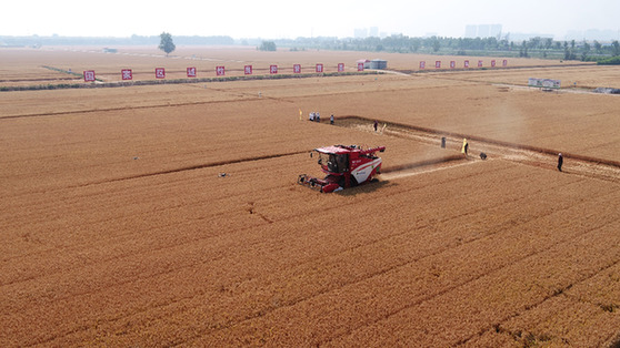 在河北省辛集市馬蘭農(nóng)場(chǎng),小麥正在收獲。受訪者供圖