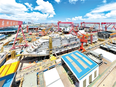 國(guó)產(chǎn)大型郵輪首制船建造場(chǎng)景。資料照片