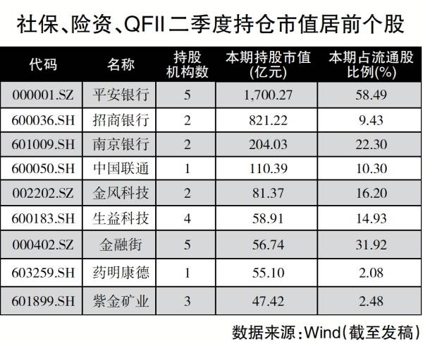 從持倉個股來看,二季度獲包括社?;?、險資、QFII在內(nèi)的長線資金持有市值前五的個股分別為平安銀行、招商銀行、南京銀行、中國聯(lián)通、金風(fēng)科技,持股市值分別為1700.27億元、821.22億元、204.03億元、110.39億元和81.37億元。此外,二季度長線資金新進(jìn)個股數(shù)量已超過百只。