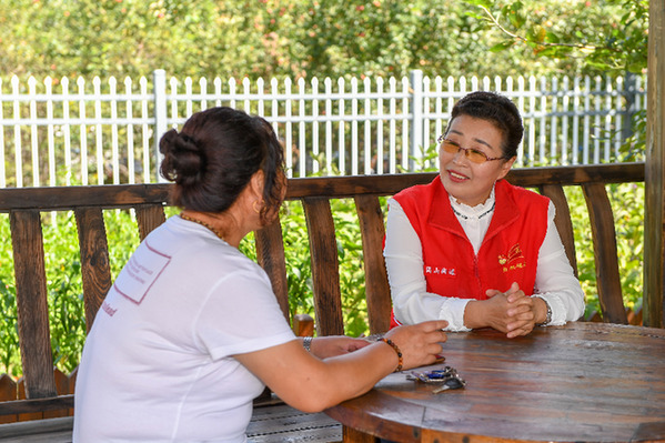 8月24日,吳亞琴(右)與團(tuán)山街道長(zhǎng)山花園社區(qū)的樓棟黨支部書(shū)記李杰聊天。新華社記者 張楠 攝