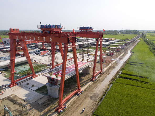 8月25日拍攝的滬渝蓉高鐵天門段首榀箱梁架設(shè)現(xiàn)場(無人機(jī)照片)。新華社記者 熊琦 攝