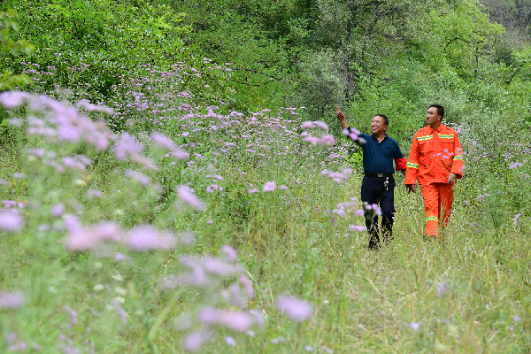 兩名林業(yè)工作人員在延安市寶塔區(qū)南泥灣鎮(zhèn)孟湫溝內巡查。記者 邵瑞 攝