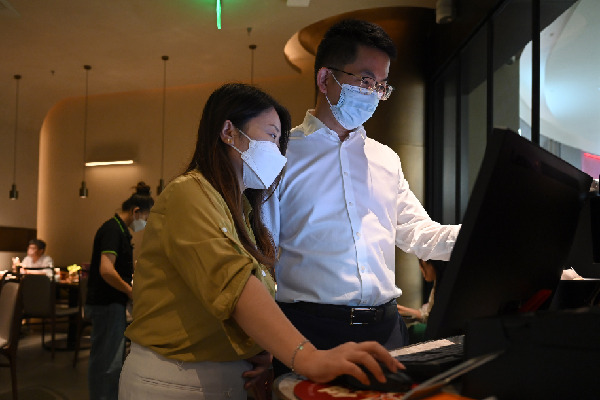 郵儲(chǔ)銀行工作人員(右)在湯城小廚查看企業(yè)經(jīng)營情況。記者 潘悅 攝