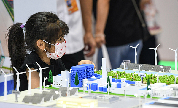 9月3日,在環(huán)境服務(wù)專題展區(qū),一名小觀眾在參觀光電碳中和模型。新華社記者 韓旭 攝