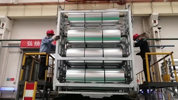 在位于甘肅省定西市隴西縣的隴西鋁箔,員工準備將分切后的鋁卷裝入退火爐。資料照片