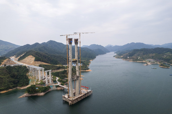 當(dāng)日,官(莊)新(化)高速全線重點(diǎn)控制性工程馬路口資水特大橋主墩封頂,即將進(jìn)入橋梁上構(gòu)施工階段,為早日通車運(yùn)行奠定了基礎(chǔ)。馬路口資水特大橋位于湖南省益陽(yáng)市安化縣柘溪水庫(kù)內(nèi),全長(zhǎng)1187米,主跨500米,其中水中主塔高202.4米。