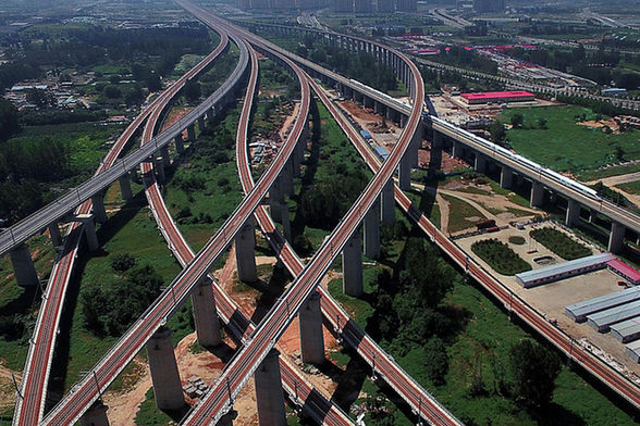 這是鄭州東站附近一處京廣、徐蘭高鐵交匯的立體樞紐(2016年9月1日攝,無人機照片)。新華社記者 李安 攝