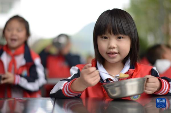 在貴州省遵義市綏陽(yáng)縣風(fēng)華鎮(zhèn)中心學(xué)校食堂,學(xué)生在吃營(yíng)養(yǎng)餐(2021年10月12日攝)。新華社記者 楊楹 攝