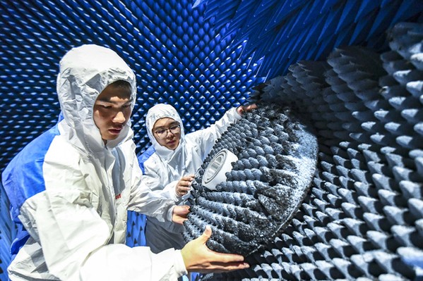 在寧波曙翔新材料股份有限公司實驗室內(nèi),研發(fā)人員對航天產(chǎn)品進行數(shù)據(jù)測試。(丁繼敏 攝)