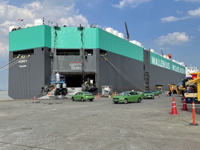天津華圖汽車物流有限公司一批二手新能源車從連云港裝船發(fā)往阿聯酋迪拜。(采訪對象供圖)
