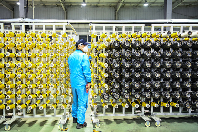 在吉林化纖集團(tuán)一生產(chǎn)車間內(nèi),工人準(zhǔn)備用碳纖維制作產(chǎn)品。