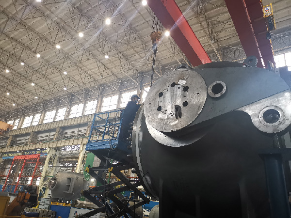 哈電集團哈爾濱電機廠有限責任公司水電分廠,工人在球閥上作業(yè)。