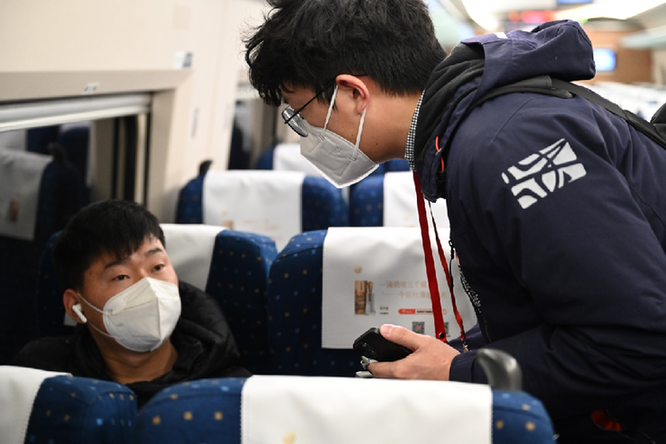同車的孫先生則要趕往石家莊。在鐵路部門工作的他為了支援春運工作起了個大早,剛接受完記者采訪就閉上眼睛休息了起來?!斑@次疫情防控政策優(yōu)化調(diào)整后,好多人都選擇回家過年,希望我的工作可以幫助到大家?!睂O先生說。