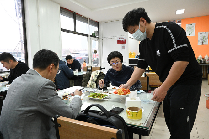 在北京軍紅發(fā)小排骨餐廳內(nèi),王興謀正在給客人上菜。記者 潘悅 攝