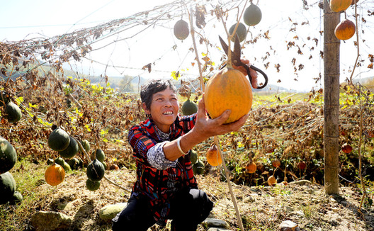 江西省蔞豐農(nóng)業(yè)科技發(fā)展有限公司黎川縣洵口鎮(zhèn)皮邊村瓜蔞基地,農(nóng)戶在采摘成熟的瓜蔞。(王武輝 攝)
