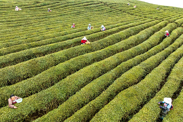 3月15日,茶農(nóng)在貴州省安順市西秀區(qū)雙堡鎮(zhèn)一茶園采摘春茶(無(wú)人機(jī)照片)。
