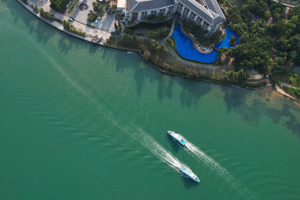 兩艘游船在博鰲東嶼島旅游度假區(qū)相向而行(3月14日攝,無人機照片)。