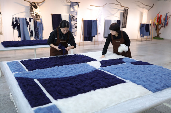 問起“回到源頭”的工藝,最大的訣竅是什么?郭秀玲坦然地說,用手“慢慢地、耐心地拍”。在耐心拍的過程中,不同著色的羊絨,它們的細(xì)纖維彼此自然地“拍合”。藝術(shù)設(shè)計(jì),不再是由流水線說一不二地完成,而是在人手與自然材質(zhì)的“可能性”中呈現(xiàn)。所以,每一件制品,都是“這一個(gè)”,沒有完全雷同的。