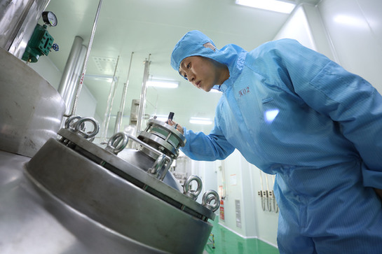 寧夏恒康科技有限公司員工正在對鹽酸二甲雙胍生產(chǎn)設(shè)備結(jié)晶釜進行檢查。 新華社記者 呂澤 攝