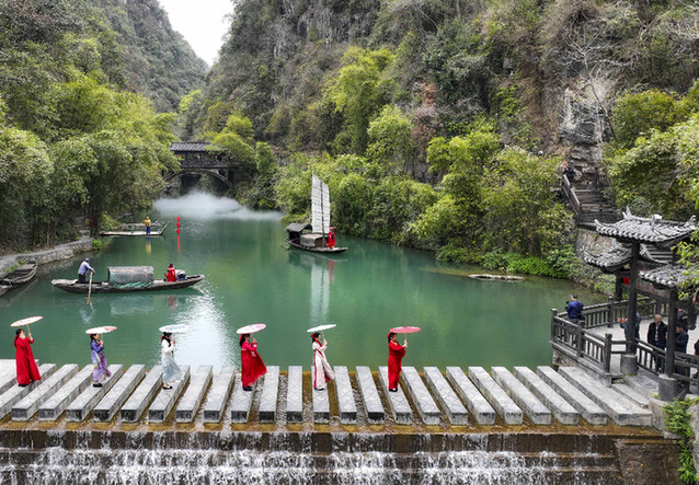 3月28日,工作人員在湖北省宜昌市夷陵區(qū)三峽人家風(fēng)景區(qū)進(jìn)行《船工號(hào)子》民俗表演(無(wú)人機(jī)照片)。