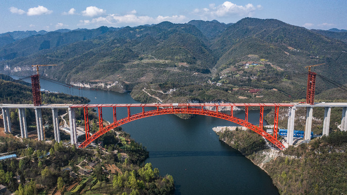 這是3月30日拍攝的德余高速烏江特大橋(無(wú)人機(jī)照片)。當(dāng)日,由中交一公局承建的德余高速烏江特大橋主體貫通。該橋位于貴州省思南、石阡、鳳岡三縣交界處,是德江至余慶高速公路的重要控制性工程,全長(zhǎng)1834米,主橋?yàn)?04米上承式鋼管混凝土拱橋。