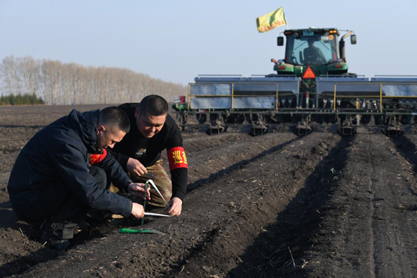 4月8日,在位于黑龍江省北安市的北大荒集團(tuán)建設(shè)農(nóng)場(chǎng)有限公司第四管理區(qū)一處農(nóng)田,農(nóng)業(yè)技術(shù)員在監(jiān)測(cè)施肥作業(yè)質(zhì)量。新華社記者 王松 攝