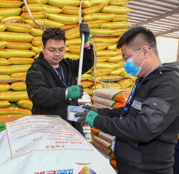 3月23日,在吉林省四平市梨樹(shù)縣一家農(nóng)資生產(chǎn)企業(yè),工作人員對(duì)企業(yè)生產(chǎn)的產(chǎn)品進(jìn)行抽樣檢驗(yàn)。新華社記者 張楠 攝