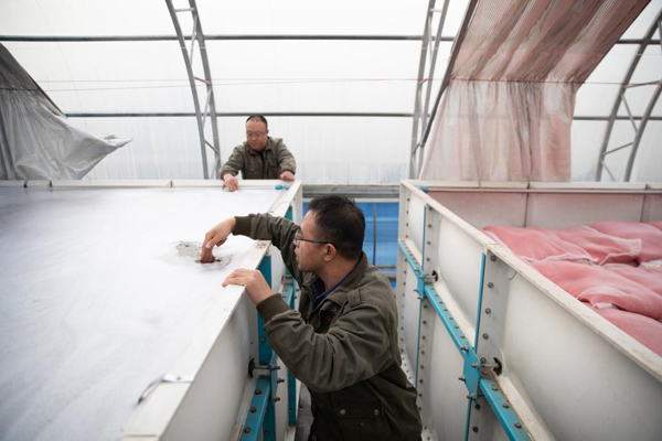 3月24日,在北大荒集團(tuán)八五〇農(nóng)場(chǎng)有限公司智能化水稻芽種生產(chǎn)中心,工作人員檢查浸種情況。新華社記者 張濤 攝